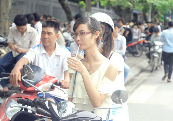 dù rất mệt mỏi khi phải đứng đợi con, em giữa thời tiết nắng nóng