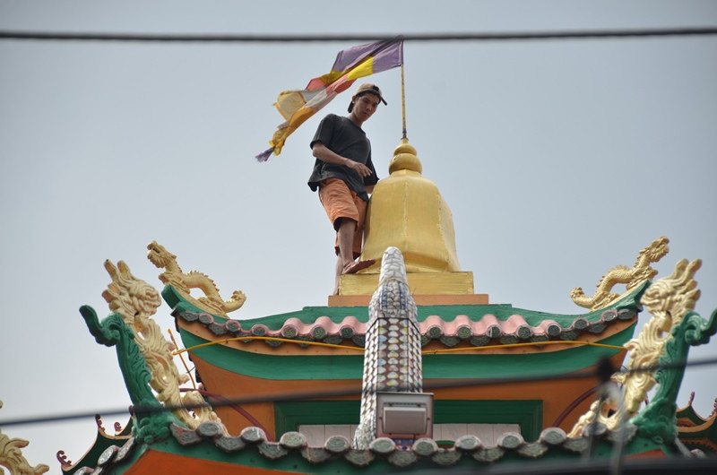 Thanh niên nghi "ngáo đá" leo lên nóc chùa An Phú