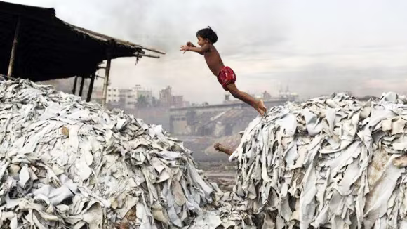 Một trẻ em chơi đùa ở khu vực thuộc da Hazaribagh bị ô nhiễm nặng nề của Bangladesh