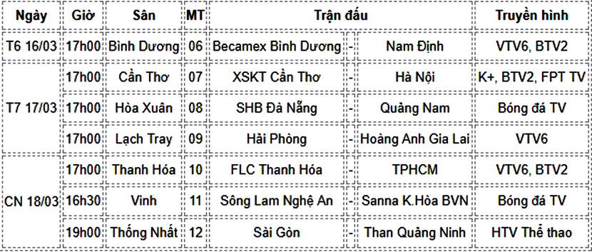 Cụ thể, chiều 16-3, VTV6 và BTV2 sẽ phát sóng trực tiếp trận Bình Dương tiếp tân binh Nam Định. Sau đó một ngày, các trận đấu tiếp theo của vòng lần lượt lên sóng như Cần Thơ - Hà Nội (K+, BTV2, FPT TV), SHB Đà Nẵng - Quảng Nam (Bóng đá TV), Hải Phòng - HAGL (VTV6).