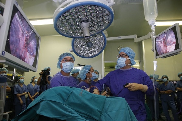 Đặc biệt, tại khóa tập huấn năm nay, các chuyên gia hàng đầu về phẫu thuật nội soi lồng ngực gồm GS.BS Hyeong Ryul Kim – Bệnh viện Asan Hàn Quốc, PGS.TS Nguyễn Hữu Ước – Trưởng Khoa Phẫu thuật Tim mạch và lồng ngực, TS.BS Phùng Duy Hồng Sơn – Khoa Phẫu thuật Tim mạch và lồng ngực (Bệnh viện Việt Đức) đã thực hiện trình diễn ca phẫu thuật nội soi lồng ngực trên bệnh nhân bị ung thư thùy dưới phổi phải.