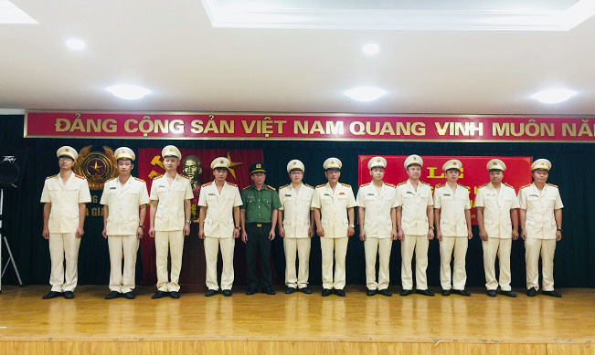 Đại tá An Thanh Bình - Trưởng CAH Gia Lâm gắn quân hàm cho các CBCS