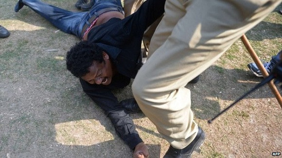 Các nghị sĩ đã làm gián đoạn phiên họp bằng cách la hét, giơ cao khẩu hiệu phản đối, đập vỡ bàn kính sau đó xông lên chụp lấy micro. Thậm chí một nghị sỹ còn xịt một bình hơi cay, khiến cả phòng họp nháo nhào chạy ra ngoài.