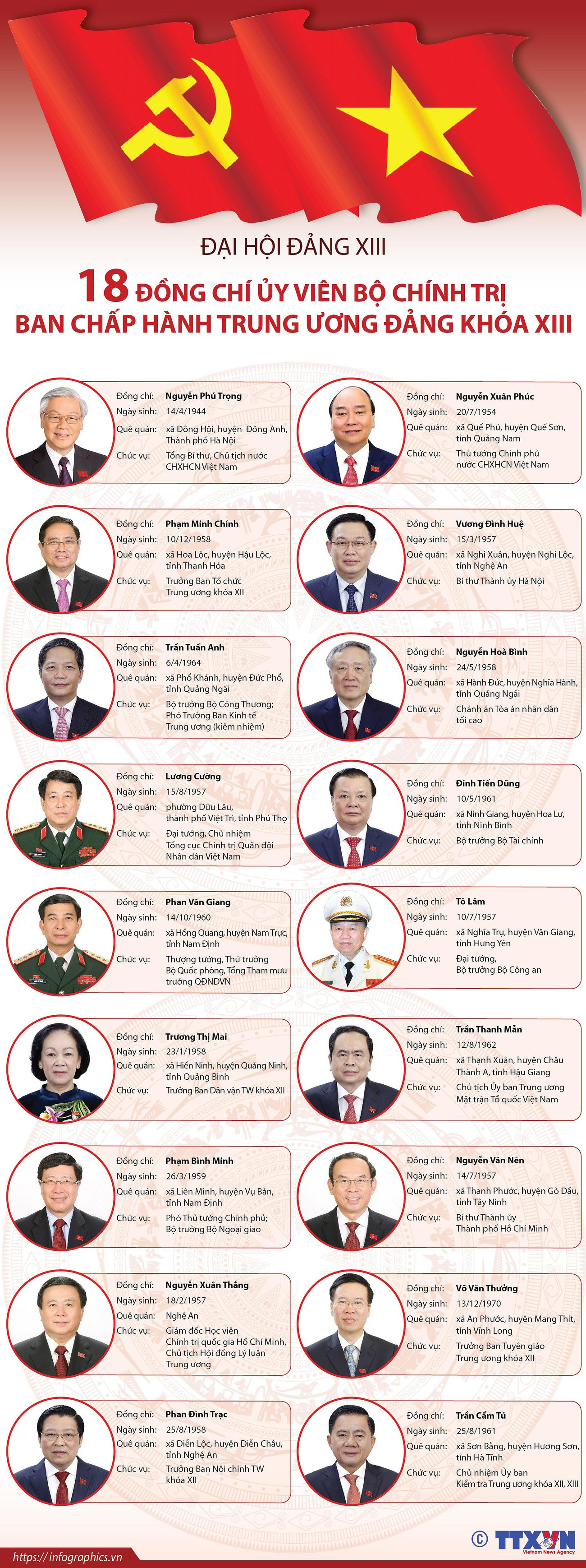 18 đồng chí Ủy viên Bộ Chính trị Ban Chấp hành Trung ương Đảng khóa XIII