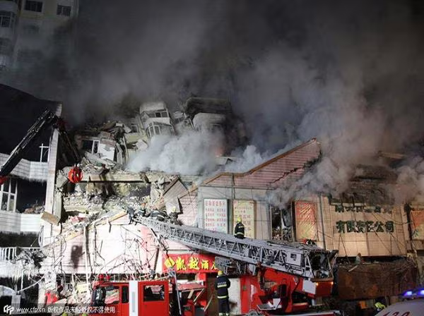 Số lính cứu hỏa này đã bị vùi lấp dưới đống đổ nát ở tầng 2 trong khi đang cố dập tắt đám cháy đã thiêu rụi tầng thứ 3 của một nhà kho tại chợ gốm Beifangnanxun ở thành phố Cáp Nhĩ Tân vào lúc khoảng 22h00 ngày 2-1.