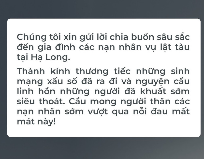 "Chúng tôi chân thành nhận trách nhiệm vì sự thiếu nhạy bén và vô tình đã gây tổn thương đến tâm lý của các gia đình nạn nhân cũng như cộng đồng. Chúng tôi xin cúi đầu nhận lỗi, chân thành mong được lượng thứ và cam kết sẽ nỗ lực tạo dựng lại niềm tin từ quý khách hàng, đối tác và cộng đồng. Chúng tôi xin gửi lời chia buồn sâu sắc nhất đến gia đình các nạn nhân của vụ tai nạn. Chúng tôi xin được cùng với tất cả cộng đồng cầu nguyện cho những người đã không may qua đời, và mong rằng gia đình các nạn nhân sẽ sớm vượt qua nỗi đau này." - thông báo nêu rõ, đồng thời thừa nhận hành động này không chỉ thể hiện sự thiếu sót trong việc thấu cảm nỗi đau mất mát to lớn mà còn không phù hợp với những giá trị nhân văn mà phía này cam kết gìn giữ và đề cao.