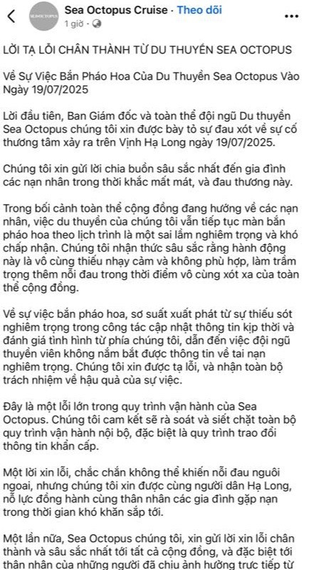 Cũng gây phẫn nộ vì tổ chức bắn pháo hoa trên du thuyền vào tối 19-7-2025, phía Ban quản lý du thuyền Sea Octopus đã gửi lời xin lỗi, thừa nhận trong bối cảnh toàn thể cộng đồng đang hướng về các nạn nhân, việc du thuyền của đơn vị này vẫn tiếp tục màn bắn pháo hoa theo lịch trình là một sai lầm nghiêm trọng và khó chấp nhận.