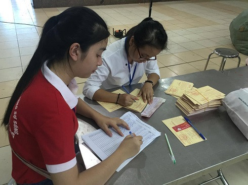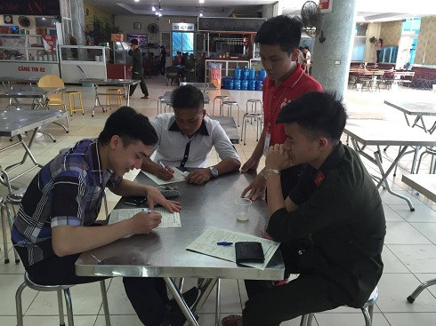 Rất đông các học viên xếp hàng chờ được hiến máu