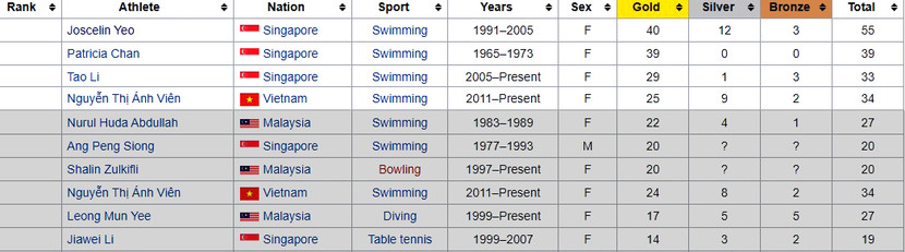 Theo đó, top 5 VĐV giành nhiều HCV nhất lịch sử SEA Games đều là nữ và đều đến từ môn bơi.