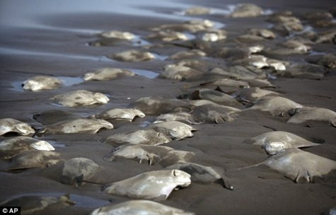 Nhiều chú cá đuối gai độc nằm phơi xác trên bãi biển (Ảnh AP)