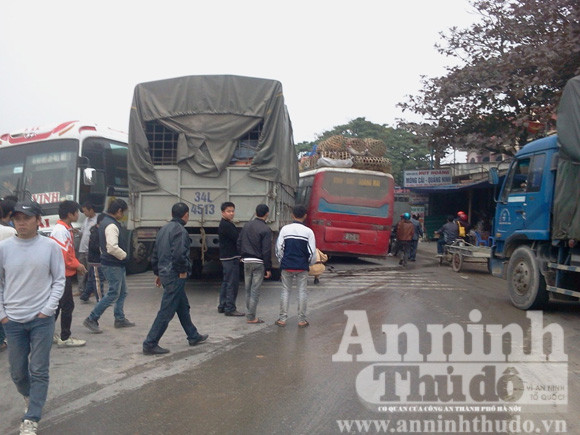 Cả ba xe “móc” vào nhau, xe tải 34L- 4513 bị kẹt giữa hai xe ca, đầu móp méo. Cả ba xe chiếm dụng toàn bộ làn đường cả hai hướng tại km 412 khiến giao thông ùn tắc nghiêm trọng với hàng trăm xe nối đuôi nhau.