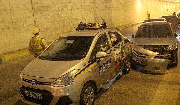 Theo thông tin ban đầu, chiếc xe taxi BKS 30A-884.22 đang di chuyển bất ngờ dừng gấp khiến xe thứ 2 mang BKS 34A 093.67 vội né sang, các xe đi sau mang BKS 30E 661.06 và BKS 30A 488.26 không kịp tránh đã dồn toa gây tai nạn.