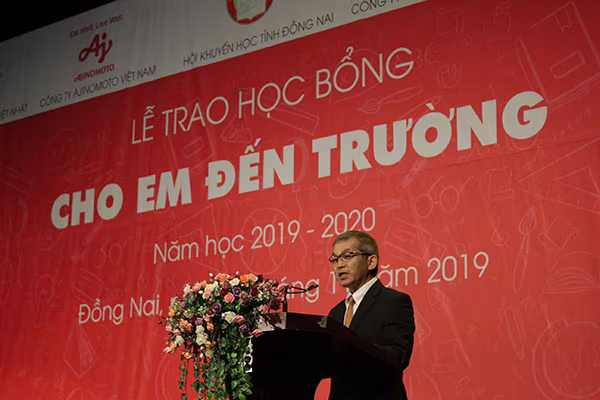 Tại buổi lễ trao học bổng ngày 16/11, đại diện đơn vị sáng lập học bổng, ông Keiji Kaneko - Tổng Giám đốc Công ty Ajinomoto Việt Nam cho biết: “Bên cạnh việc phát triển kinh doanh, chúng tôi tin rằng Công ty không thể lớn mạnh mà không có sự phát triển bền vững từ tỉnh nhà và người dân địa phương. Và có lẽ tất cả quí vị ở đây đều đồng ý rằng, việc tạo điều kiện cho giáo dục và học tập của các thế hệ tương lai là một trong những cách nổi bật nhất để phát triển xã hội. Với niềm tin này, Công ty Ajinomoto Việt Nam đã khởi xướng học bổng “Cho em đến trường” và năm nay chúng tôi rất vui mừng được tổ chức năm thứ 16 liên tiếp. Đây cũng là năm thứ 6 liên tiếp chúng tôi nhận được sự đồng hành của ba doanh nghiệp Nhật Bản là Công ty cổ phần Gas Việt Nhật, Công ty Quadrille Việt Nam và Công ty Kureha Việt Nam cùng đóng góp vào sự phát triển của nền giáo dục tỉnh Đồng Nai.