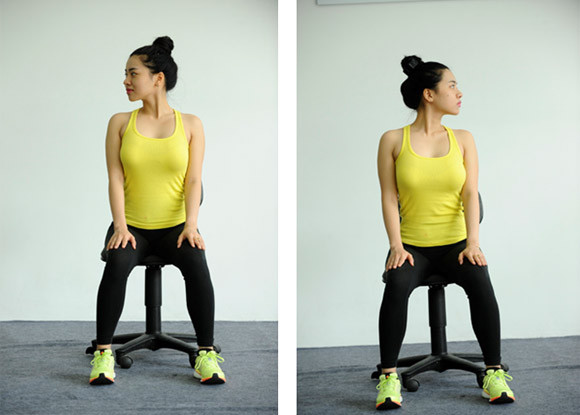 Ngồi trên ghế, thẳng lưng, nâng cằm, mắt nhìn thẳng. Từ từ quay sang trái cho tới hết biên độ. Giữ khoảng 5 giây rồi tiếp tục đổi phải.
