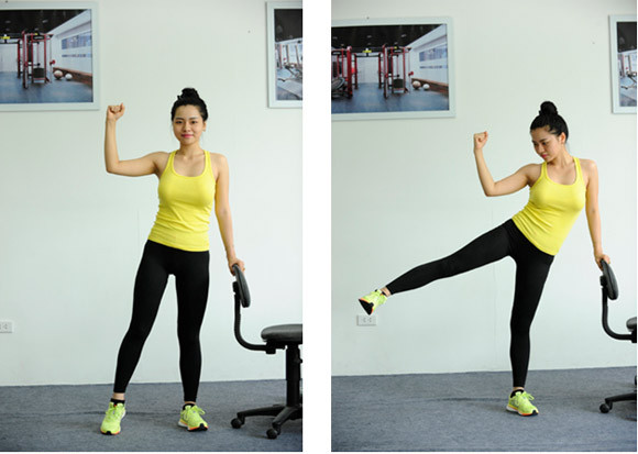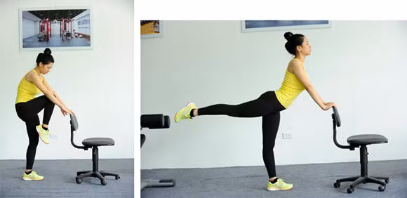 Hai tay bám ghế, lấy chân trái làm trụ, chân phải co gối. Thực hiện động tác đưa chân phải thẳng ra sau. Liên tục đổi chân, thực hiện 15 – 20 lần mỗi bên. Lưu ý luôn giữ người thẳng, khi đá chân thì hít vào, về tư thế chuẩn bị thì thở ra.