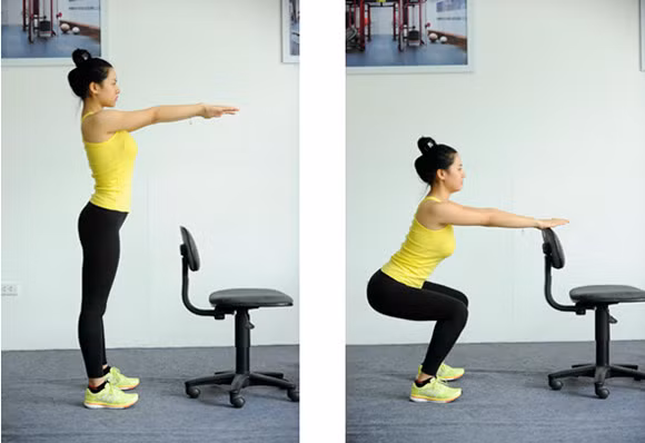 Hai chân đứng rộng hơn vai, thân người thẳng, hai tay bám vào lưng ghế. Từ từ hạ đùi và mông ra sau. Kết thúc động tác trở lại vị trí ban đầu. Lặp lại động tác từ 15 – 20 lần. Lưu ý đầu gối không vượt quá mũi bàn chân, đùi song song với mặt sàn.