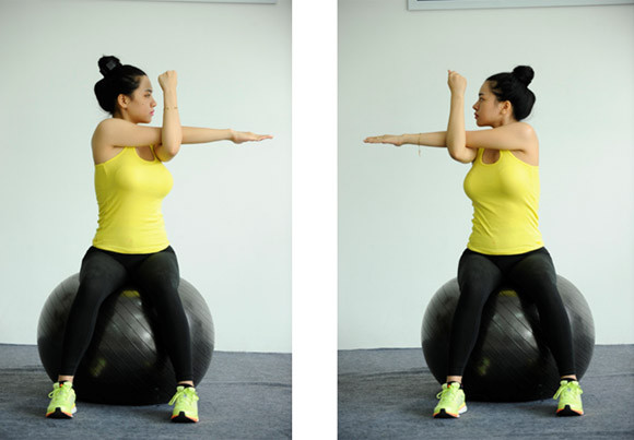Ngồi thoải mái, lưng thẳng. Tay trái ngang vai, cẳng tay co lại vuông góc. Tay phải đặt trên tay trái, từ từ kéo cho tới khi vai phải vai phải căng. Giữ từ 5 – 10 giây. Thực hiện động tác tương tự với vai trái.