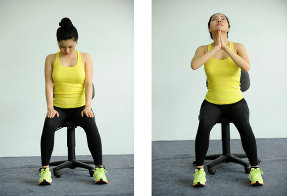 Ngồi trên ghế thẳng lưng, hai tay bám ghế. Chân trái duỗi thẳng song song với mặt đất. Thực hiện động tác gập gối trái về sát bụng, hít vào. Thở ra thân người hơi gập về trước. Tương tự đổi bên mỗi chân làm từ 15-20 lần.