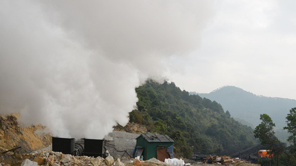 Khói vẫn bốc lên tại cửa thông gió của mỏ than bị cháy trong sáng 16-1