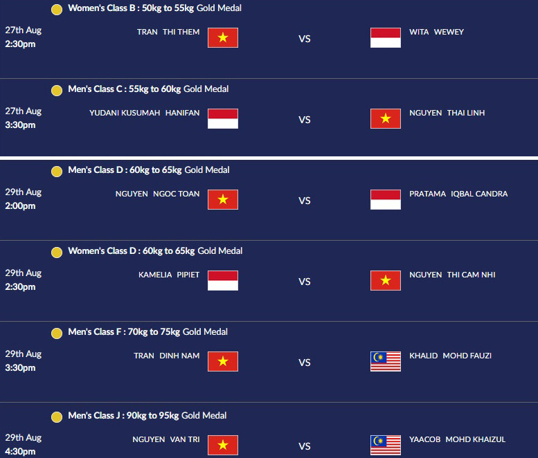 Dẫu vậy, chúng ta vẫn có tới 6 VĐV giành quyền vào chung kết gồm Trần Thị Thêm (50kg-55kg nữ), Nguyễn Thái Linh (55kg-60kg nam), Trần Đình Nam (70kg-75kg nam), Nguyễn Ngọc Toàn (60kg-65kg nam), Nguyễn Thị Cẩm Nhi (60kg-65kg nữ), Nguyễn Văn Trí (90kg-95kg nam).