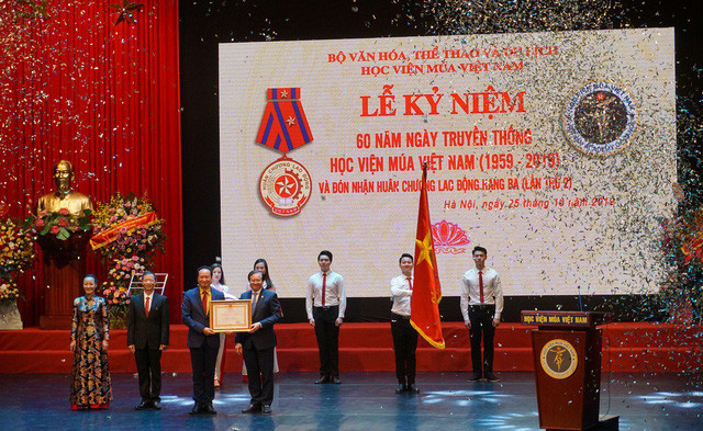 Tại buổi lễ, thừa ủy quyền của Chủ tịch nước, Bộ trưởng Bộ VHTT&DL, Thứ trưởng Tạ Quang Đông đã trao tặng Huân chương Lao động hạng Ba (lần II) cho nhà trường.