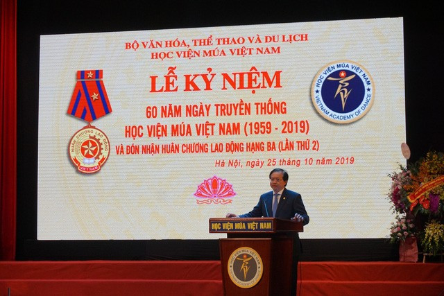 Phát biểu tại buổi lễ, Thứ trưởng Bộ VHTT&DL Tạ Quang Đông đã ghi nhận và chúc mừng những thành tích mà tập thể lãnh đạo, giảng viên, học viên của trường đã đạt được trong 60 năm qua. Thứ trưởng khẳng định, 60 năm qua, các thế hệ thầy và trò Học viện Múa Việt Nam đã viết nên những trang sử vẻ vang, đáng tự hào của nhà trường.