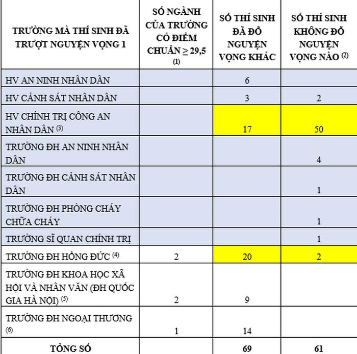 Có 130 thí sinh có điểm 29,5 trở lên trượt nguyện vọng 1. Trong số này, có 61 em không đõ nguyện vọng nào và 69 em trúng tuyển nguyện vọng khác.