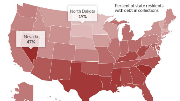 Tiểu bang Nevada, nơi có thành phố Las Vegas, thiên đường của sòng bạc, đang có tỷ lệ số dân nợ xấu cao nhất, lên đến 47% tổng dân số tiểu bang và số tiền nợ xấu trung bình mỗi người cũng dẫn đầu nước Mỹ, 7.198 USD. Những con số này có sự đóng góp rất lớn từ thành phố Las Vegas, nơi 49% dân số dính nợ xấu.