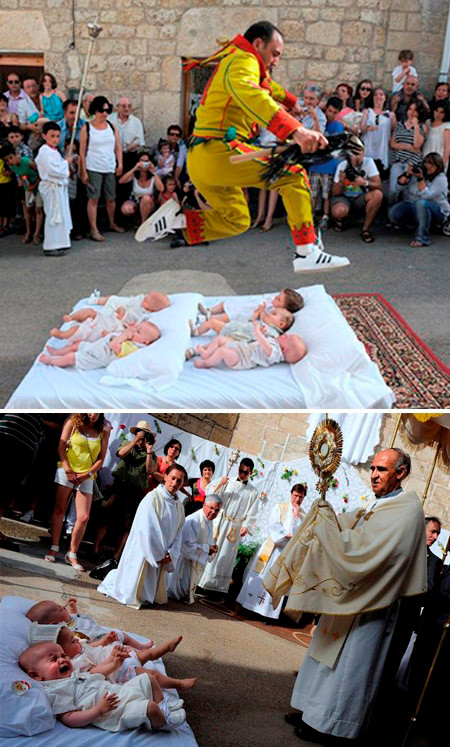 Trong kỳ nghỉ lễ có một nghi thức gọi là nhảy qua người các em bé. Một cô gái sẽ rải những cánh hoa hồng lên người các em bé được sinh ra trong vòng một năm trở lại đây. Một vị linh mục sau đó sẽ làm lễ phù hộ cho các bé và một người đàn ông trong trang phục quỷ, gọi là Colacho sẽ nhảy qua các em bé đang nằm trên phố.