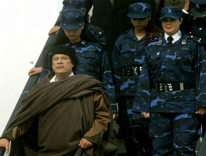 Đại tá quân đội Muammer Gaddafi (69 tuổi) được coi là một người lập dị và tàn nhẫn. Đội cận vệ Amazonian Guard gồm gần 200 phụ nữ được thành lập để bảo vệ ông ta. Những lính nữ này là những chuyên gia về võ thuật và sử dụng các loại vũ khí.