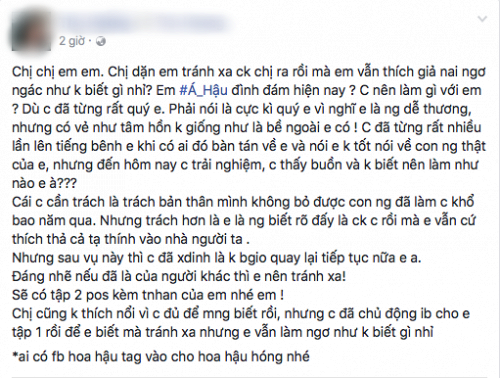 Theo lời chia sẻ của chủ nhân dòng status gây “sốc” trên thì cô và Á hậu Huyền My khá thân nhau và cô từng rất quý Huyền My. Sau khi biết Huyền My và bạn trai của mình nhắn tin “thả thính” qua lại, cô đã chủ động nhắn tin cho Huyền My một cách nhẹ nhàng, khéo léo nhắc Huyền My về việc người đó là người yêu của mình.