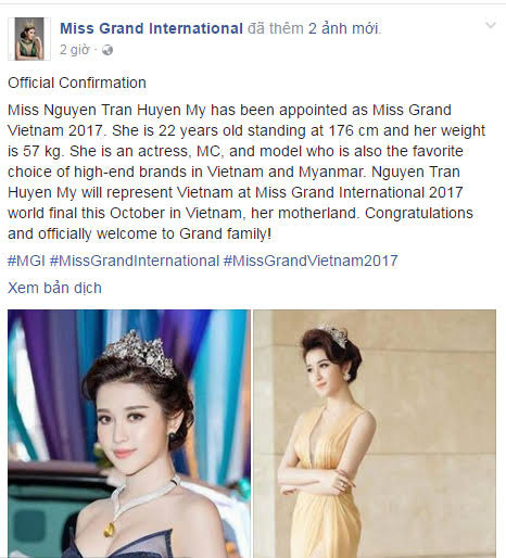 Mới đây, Á hậu "Hoa hậu Việt Nam 2014" Huyền My tiết lộ cô đã được đơn vị nắm bản quyền cuộc thi "Miss Grand International 2017" (Hoa hậu Hòa bình Quốc tế) gửi lời mời tham dự sân chơi sắc đẹp này. Dự kiến cuộc thi sẽ diễn ra vào tháng 10 tới tại Việt Nam.
