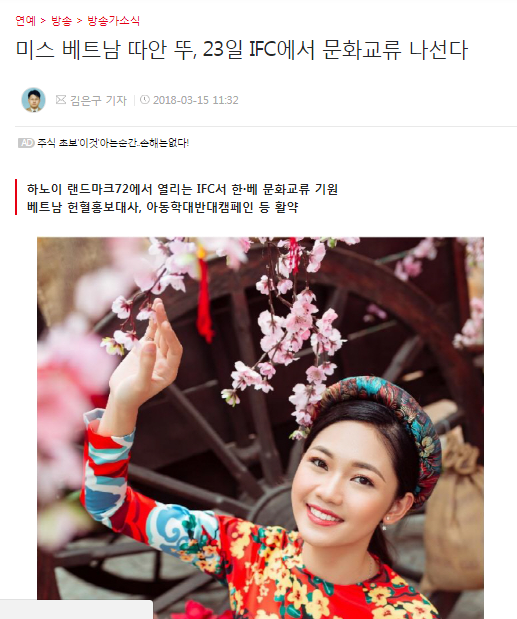 Theo đó, Á hậu Thanh Tú xuất hiện trên trang báo này với tư cách người đẹp duy nhất của Việt Nam sẽ tham dự Hội nghị Tài chính quốc tế Việt – Hàn diễn ra tới đây tại Hà Nội. Sự kiện quan trọng này sẽ có sự góp mặt của nhiều lãnh đạo và chính khách của hai nước.