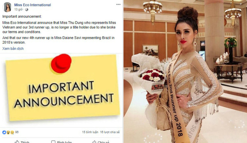 Thông báo tước vương miện của Thư Dung được đăng tải trên trang Fanpage cuộc thi "Miss Eco International 2018'