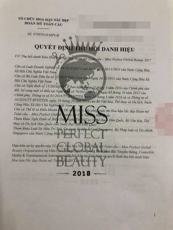 Quyết định tước danh hiệu "Hoa hậu Sắc đẹp Hoàn mỹ 2017" của Thư Dung