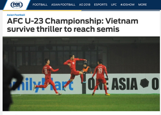 Trang Fox Sports đăng bài tường thuật với dòng tít: "U23 Việt Nam đào thoát ngoạn mục vào bán kết". Rất nhiều đoạn trong bài của Fox Sports bày tỏ sự ngạc nhiên trước diễn biến theo kịch bản khó tin của trận đấu.