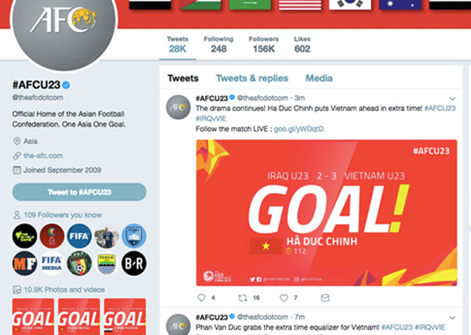 Tài khoản Twitter của LĐBĐ châu Á liên tục cảm thán khi tường thuật trận đấu của U23 Việt Nam với U23 Iraq