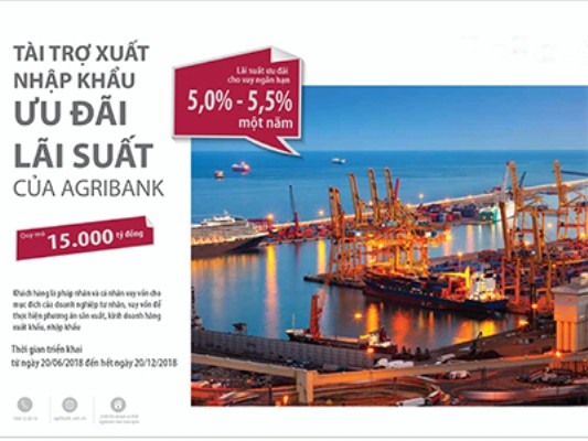 Với mong muốn hỗ trợ các khách hàng có năng lực tài chính tốt, chủ động nguồn vốn, phát triển hoạt động xuất nhập khẩu, từ nay đến hết 20/12/2018, Ngân hàng Nông nghiệp và Phát triển Nông thôn Việt Nam (Agribank) triển khai gói tín dụng 15.000 tỷ đồng ưu đãi lãi vay ngắn hạn chỉ từ 5,0%/năm.