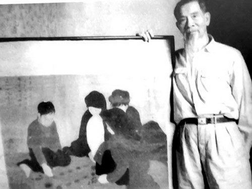 Danh họa Nguyễn Phan Chánh bên bức tranh lụa "Chơi ô ăn quan"