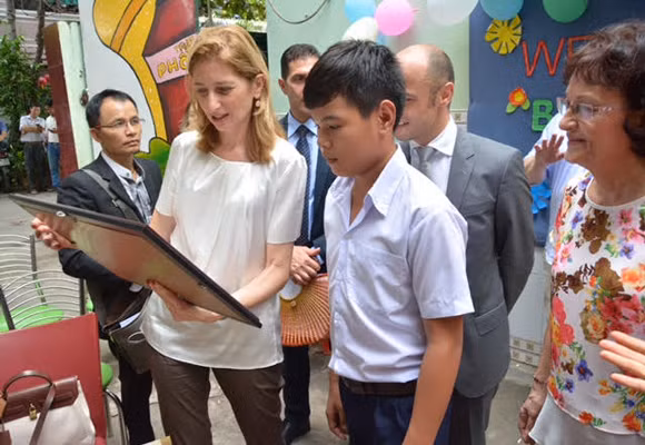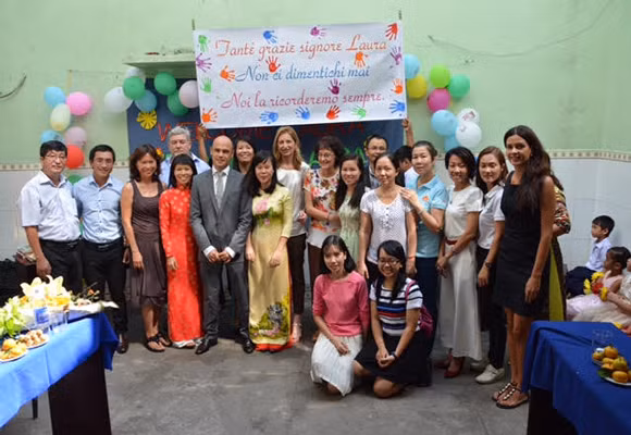 Bà Laura Mattarella chụp ảnh lưu niệm với giáo viên, học sinh trường phổ cập, quận Bình Thạnh