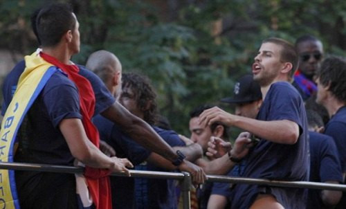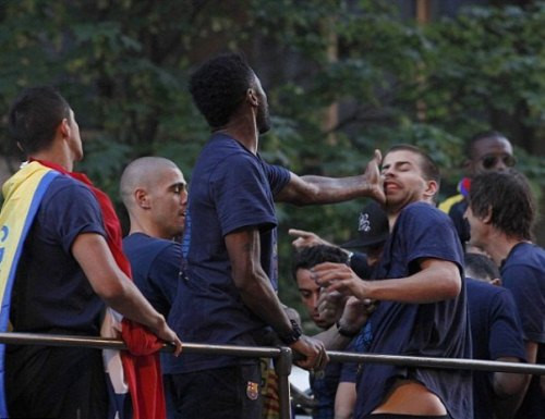 Mới đây, các phương tiện truyền thông đồng loạt đăng tải các bức ảnh cho thấy Alex Song và Gerad Pique 'thượng cẳng tay, hạ cẳng chân' trên xe bus lúc Barcelona diễu hành ăn mừng.