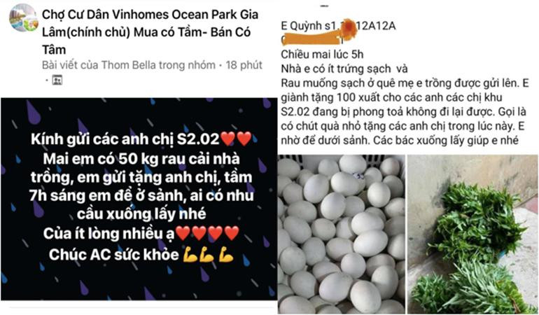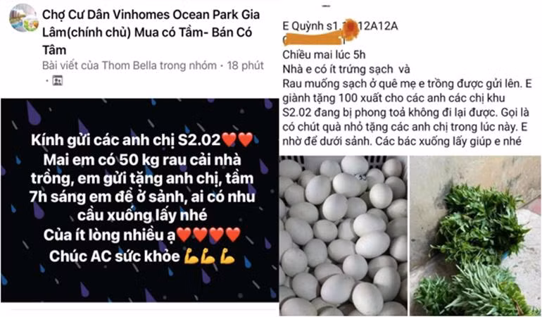 "Em có 50kg rau cải nhà trồng, em tặng anh chị, ai có nhu cầu xuống lấy nhé", "Chiều mai nhà em có ít trứng sạch, rau muống ở quê mẹ em trồng gửi lên. Em dành tặng 100 suất cho các anh chị khu S2.02". Có rất nhiều lời gửi gắm như thế, ai có gì tặng nấy, người không có sẵn thì cùng nhau quyên góp rồi xắn tay vào làm đồ ăn, phân chia theo từng suất.
