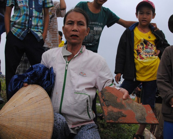 Trong khi đó, nhiều phụ nữ vẫn đang tay xẻng, tay cuốc hì hục đào đất và tát nước từ phía nền móng ngôi mộ ra ngoài với quyết tâm… "san bằng ngôi mộ thì con em trong làng không còn bị chết yểu", cầm viên gạch men, là một phần của con "rùa đá" vừa được lấy lên từ huyệt mộ, bà Đặng Thị Lài (41 tuổi) nói trong bức xúc: Mặc dù không phải là người mê tín và tui cũng không tin là có chuyện "rùa đá" trấn yểm "long mạch" chi đó nhưng khi phá bỏ được thành mộ, đào hết lớp cát đến cái huyệt để đặt quan tài, chúng tôi thấy bên trong huyệt đúng thật là có mấy viên gạch vồ và gạch men được xây thành hình con "rùa đá".