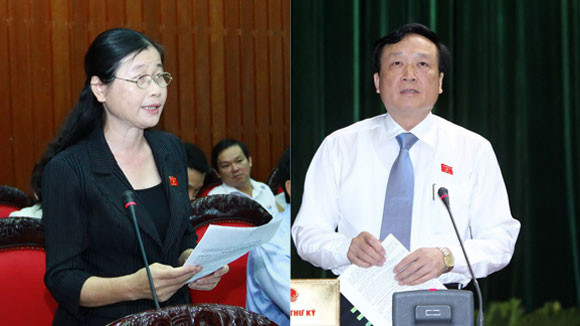 ĐBQH Đỗ Thị Hoàng (trái) chất vấn Viện trưởng VKSNDTC Nguyễn Hòa Bình