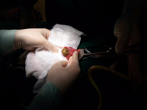 Các bác sĩ đã tiến hành xử trí bóp nhỏ bã thức ăn, tuồn dịch và các bã thức ăn trên chỗ tắc xuống đại tràng, mở dạ dày lấy 2 khối bã thức ăn sau đó rửa ổ bụng.