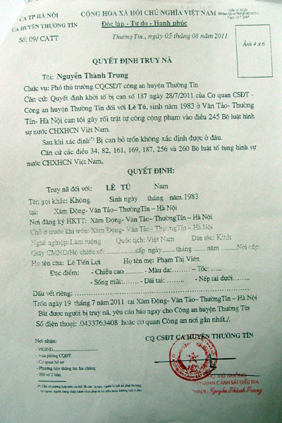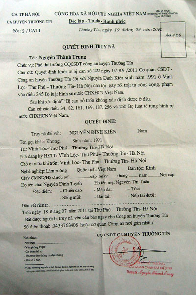 Nhận được quyết định truy nã 2 đối tượng Lê Văn Tú; Nguyễn Đình Kiên (SN 1991), của CAH Thường Tín, Phòng 4 Cục Cảnh sát truy nã tội phạm đã tổ chức lực lượng “truy nóng”. Chiều 24-2, biết không thể trốn tránh được tội lỗi, Tú đã xin ra đầu thú, khai nhận hành vi phạm tội. Kiên bị bắt ngay sau đó khi đang lẩn trốn ở ngoại thành Hà Nội.