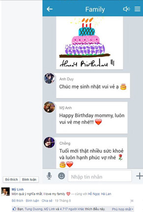 Giọng ca “Tóc ngắn” vừa khoe được cả đại gia đình chúc mừng sinh nhật khi đang lưu diễn xa. Trong ứng dụng chat nhóm của Zalo, chồng (nhạc sĩ Anh Quân) và ba con (Anna Trương, Anh Duy và Mỹ Anh) đều gửi những lời tràn đầy yêu thương tới diva của làng nhạc Việt. Tình cảm gia đình là món quà ý nghĩa nhất cuộc đời mà Mỹ Linh cảm thấy tự hào.