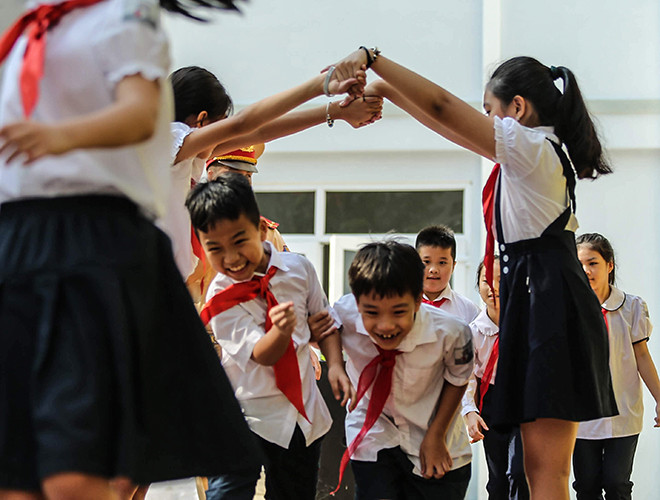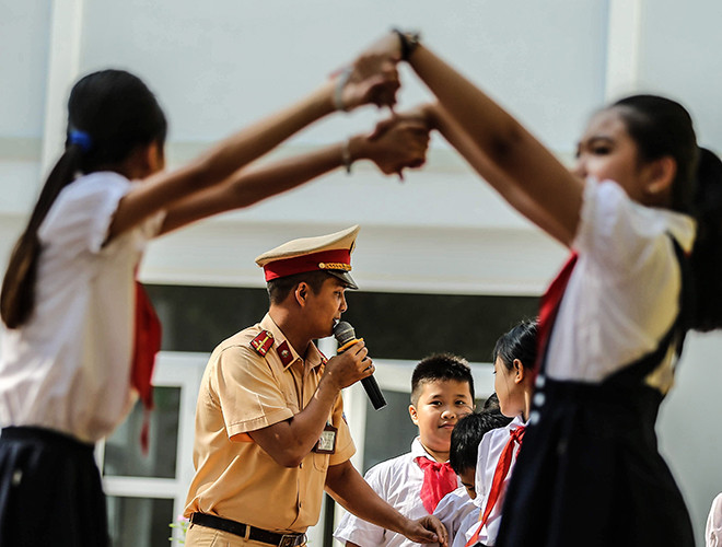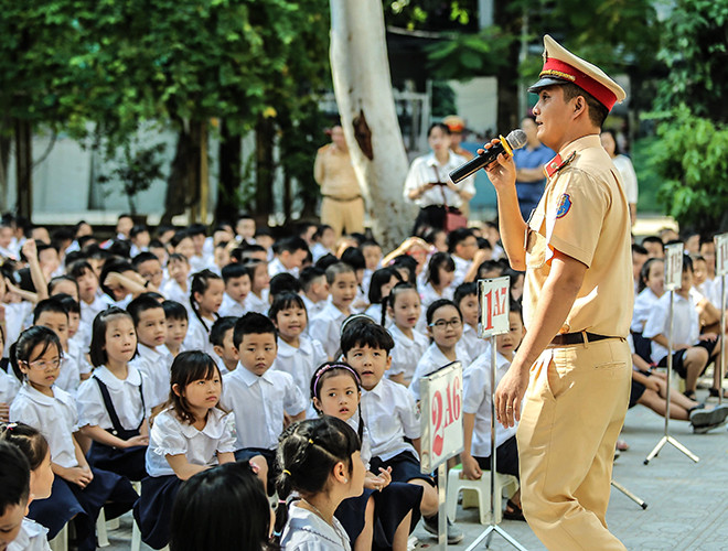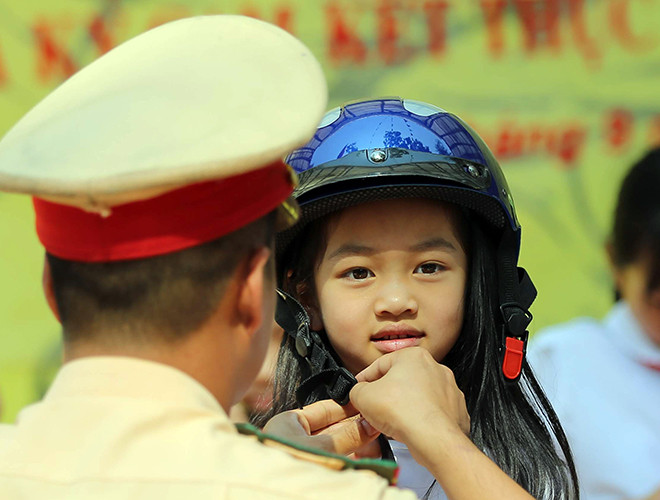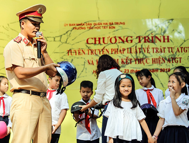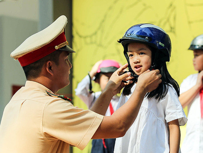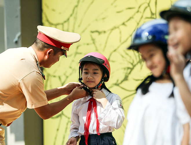 [ẢNH] 1.000 học sinh tiểu học thích thú được CSGT Hà Nội dạy đội mũ bảo hiểm đúng cách