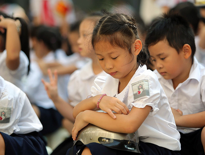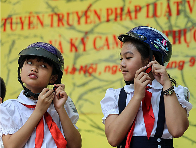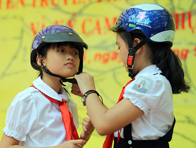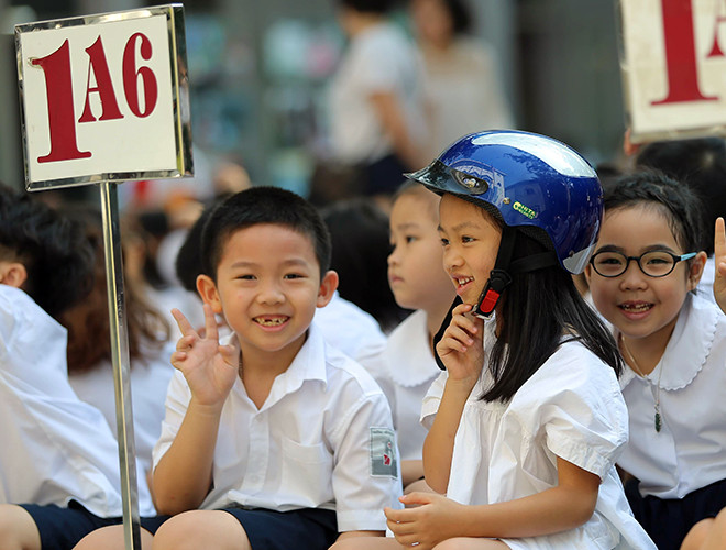 [ẢNH] Học sinh và phụ huynh Hà Nội rạng ngời đi bộ kêu gọi đội mũ bảo hiểm cho trẻ em