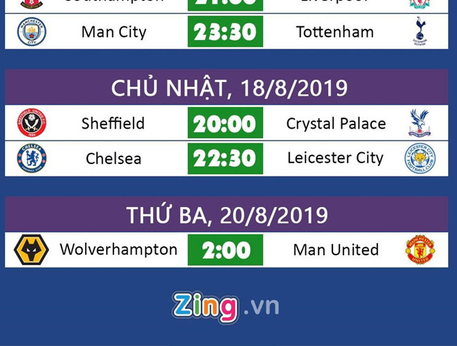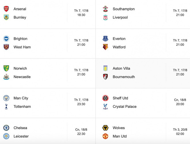 ANTD.VN - Vòng 2 Premier League 2019 sẽ diễn ra từ ngày 17-8 đến 20-8. Tâm điểm chú ý vòng này là cuộc đại chiến giữa Man City và Tottenham - màn tái hiện tứ kết Champions League 2018. Ngoài ra, những trận đấu khác như: MU với Wolverhampton, Chelsea với Leicester… cũng đều rất đáng chú ý.